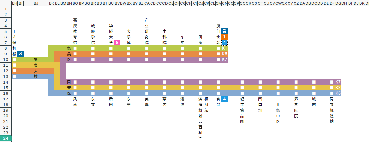 就……挺无聊的。之前坐车的时候,莫名感觉车站里的 BRT 线路图挺好看的,就用 Excel 模仿了一个。