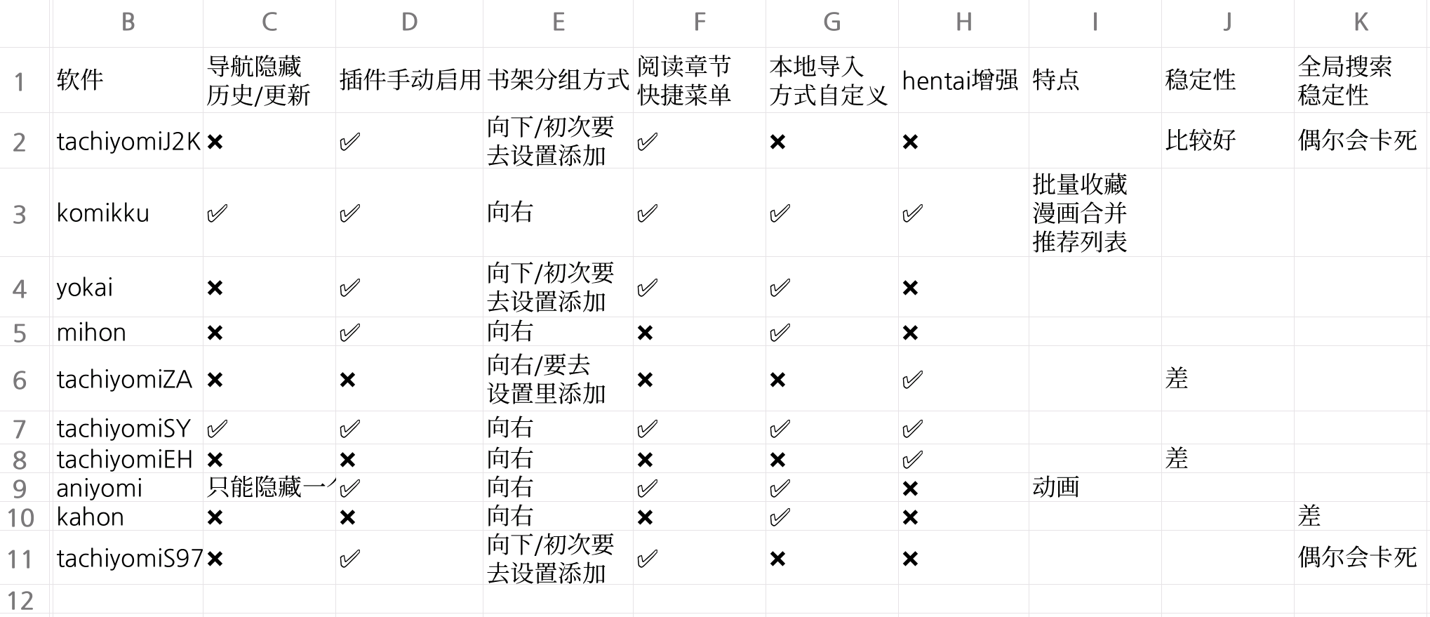 表格里的 本地/在线 一列更是莫名其妙,全都是一样的“在线”,网络源的软件难道还有纯本地的吗?tachiyomi系列大多也有支持本地漫画阅读的,也没体现出来…