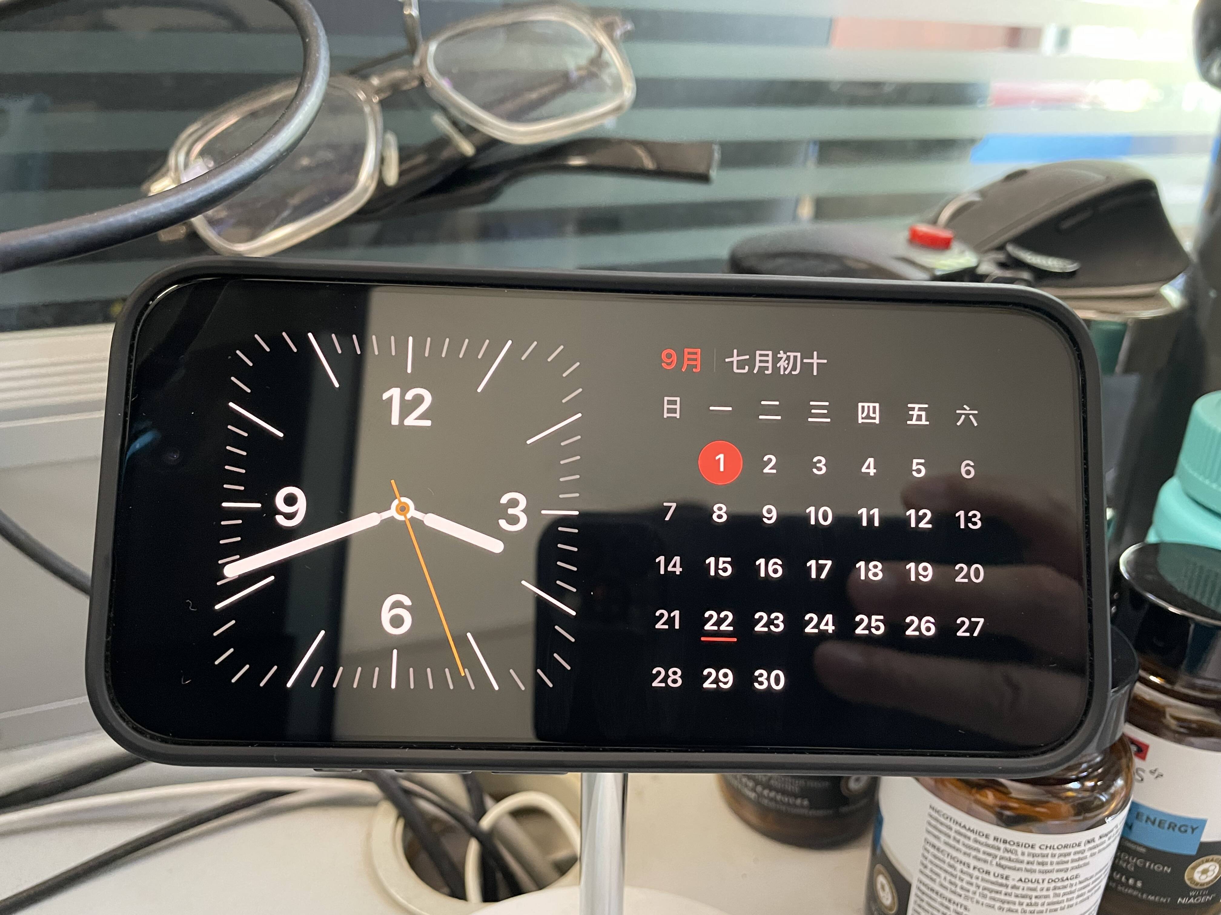平时我的 iPhone 用 MagSafe 支架充电,充电时 iPhone 屏幕上显示时钟、日历、天气之类的信息内容,就是这样: