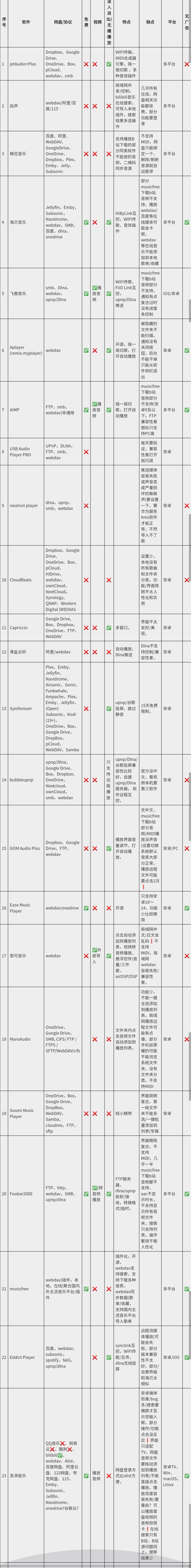 | 序号 | 软件 | 网盘/协议 | 免费 | 视频 | 淡入淡出/无缝播放 | 特点 | 缺点 | 平台 | 无广告 |