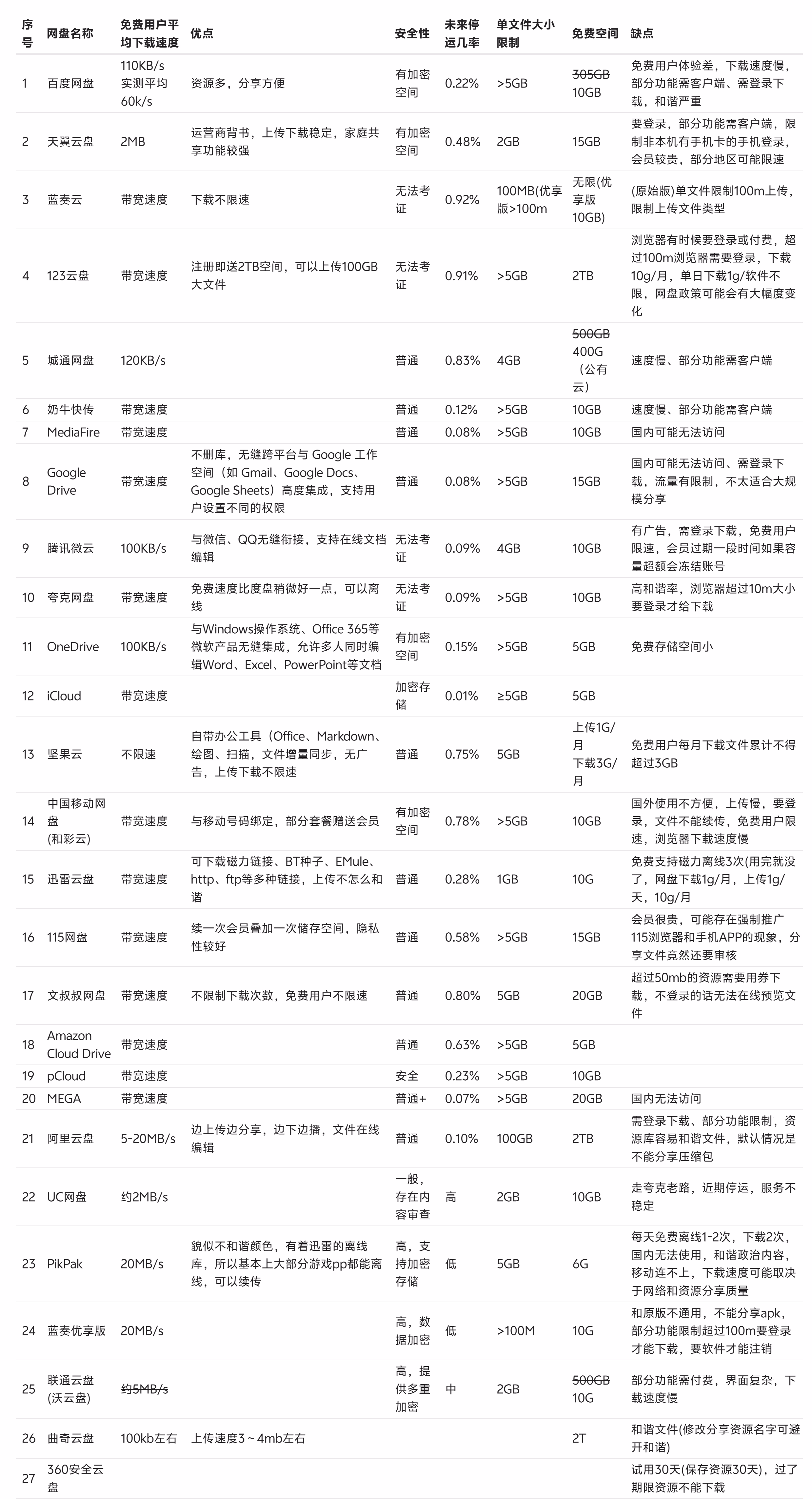 序号 | 网盘名称 | 免费用户平均下载速度 | 优点 | 安全性 | 未来停运几率 | 单文件大小限制 | 免费空间 | 缺点 |
