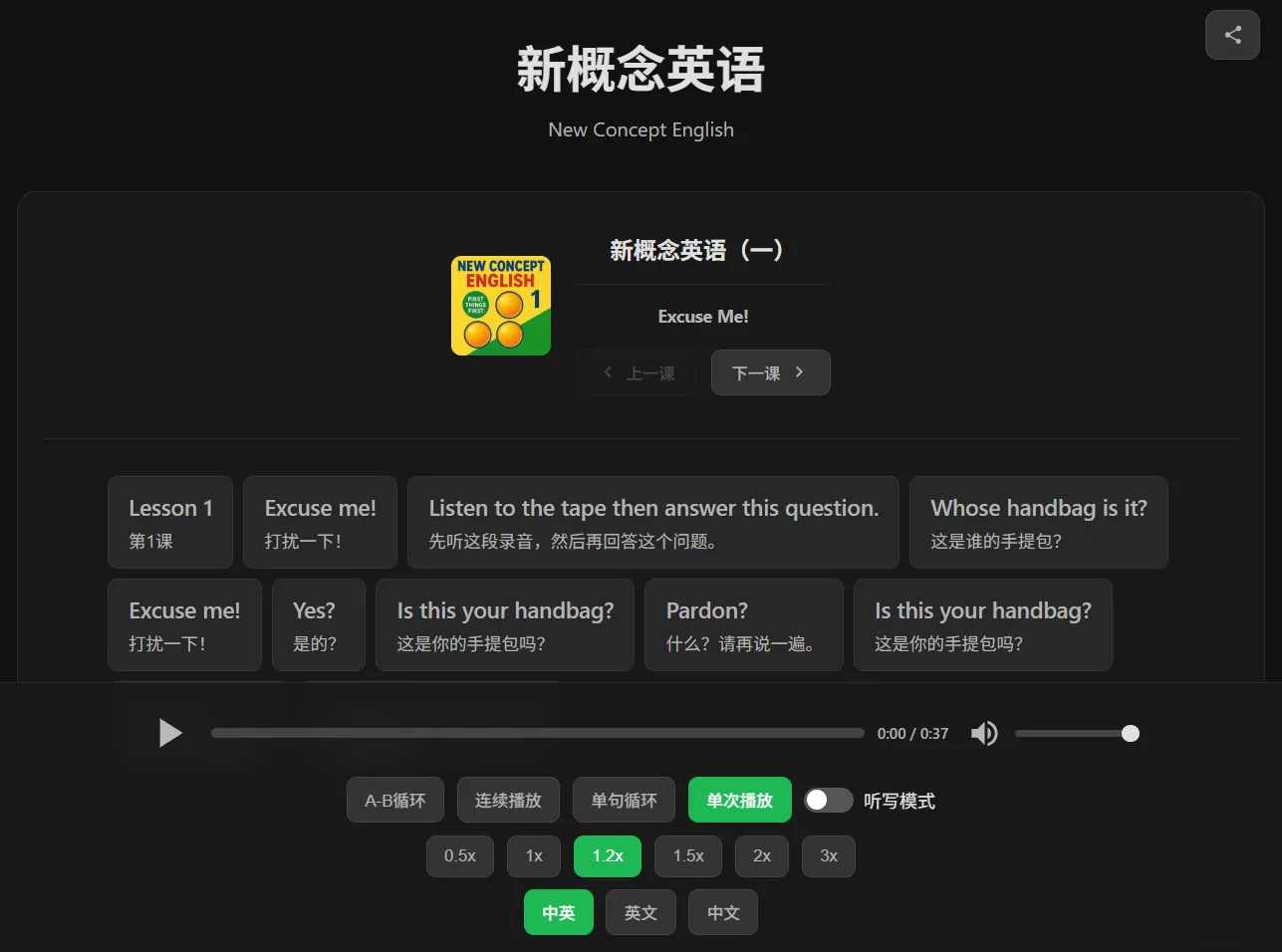 这个项目直接唤起了我死去的记忆,正好我丫头到了刷英语的年纪,于是我根据自己的喜好 fork 了一版自用。支持双语对照 / 点读 / AB循环 / 听写模式 / 历史记录等。