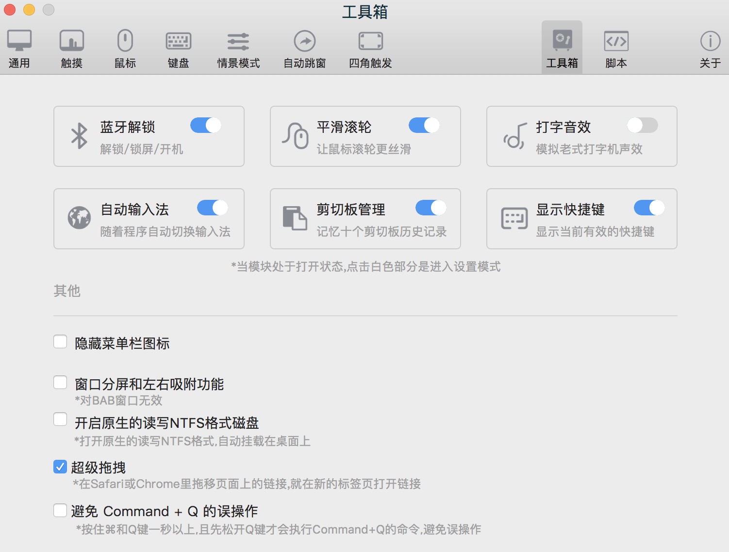 真的要顶一下这个软件,小众官网竟然没介绍,今天偶然在他们官网看到,真的很好用。一个是Safari终于有了拖拽后台打开链接的功能,另外触摸板手势操作要比鼠标右键或者中键的手势操作直观好用很多啊,还有类似手机的选中弹出菜单,对于快速操作文本和文件都有巨大帮助。其他一堆辅助功能就不列举了,学习成本还是有点的,不过确实很好用,应该算是Mac必备
