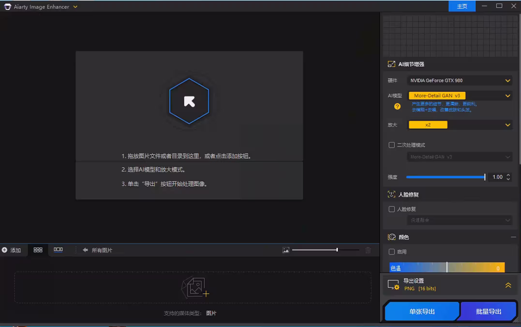 从Aiarty官网下载安装包,过程无脑“下一步”即可,没有捆绑软件,好评。软件界面非常简洁直观,主要分为三个区域:左侧为添加图片/文件夹, 右侧是选择AI模型和调整参数的核心区域,底部可设置输出路径和图片格式。新手也能立刻上手。