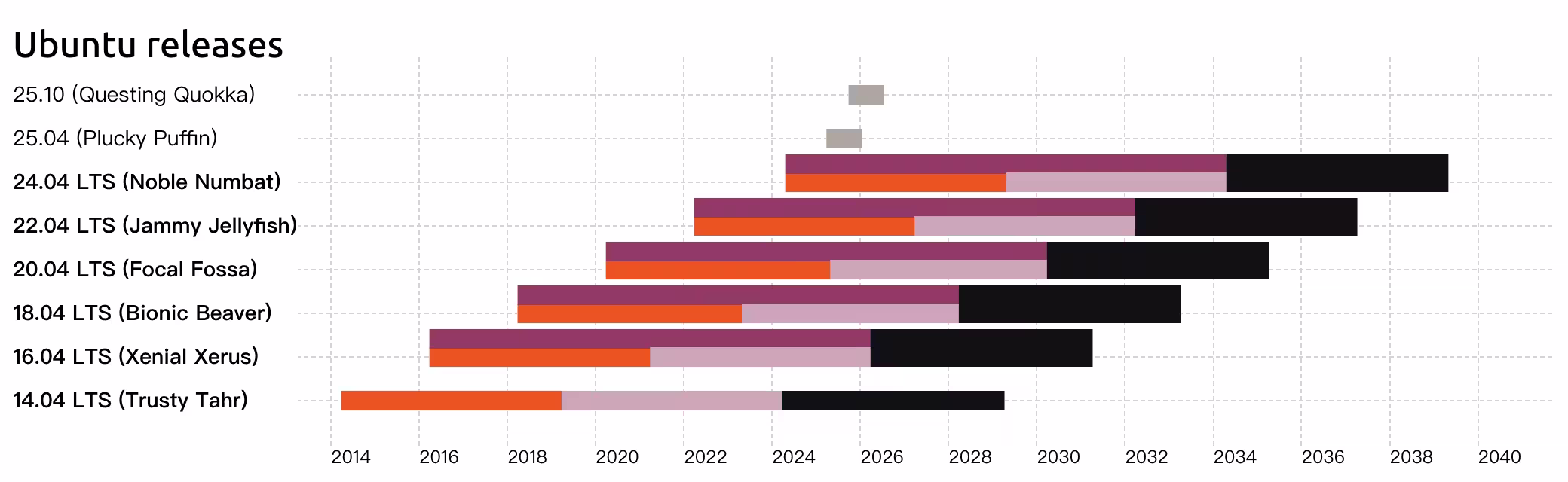 目前还在支持的版本中,最早的是 2014 年发布的 14.04 LTS,可以持续到 2029 年。
