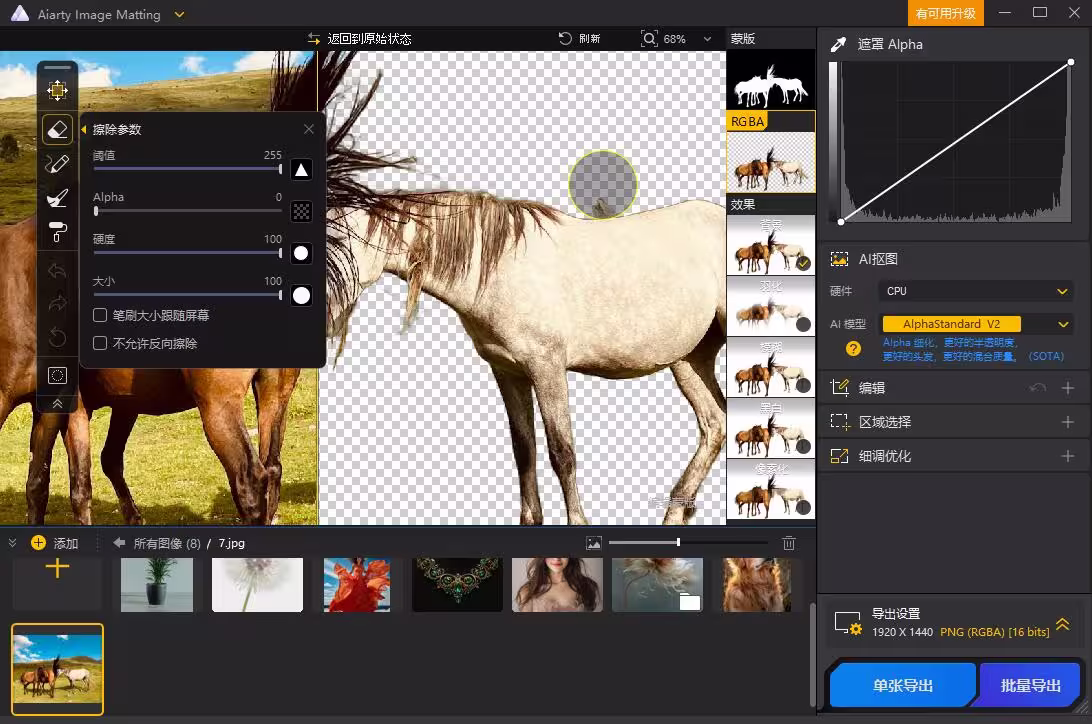 当然,AI也不是一定就完美,因此 Aiarty Image Matting 在智能抠图后,还提供了一系列实用的编辑工具,方便用户进行精细化调整。用户不仅可以对选区边缘进行微调与羽化,还能通过擦除、恢复功能局部修正选区,甚至利用减淡加深工具调整画面局部透明度。