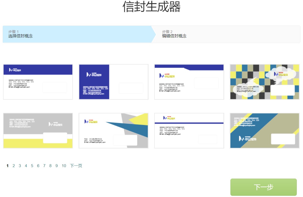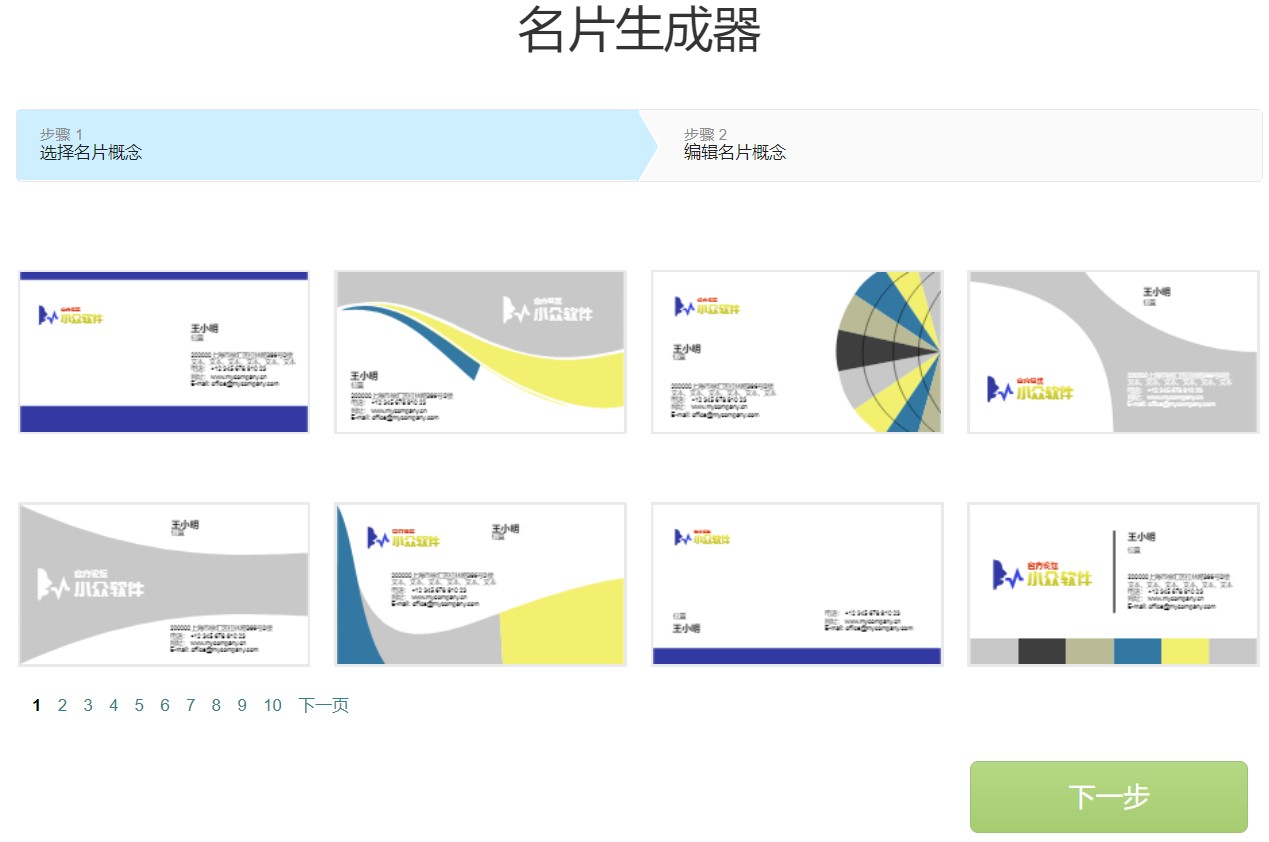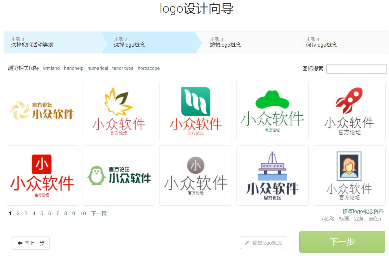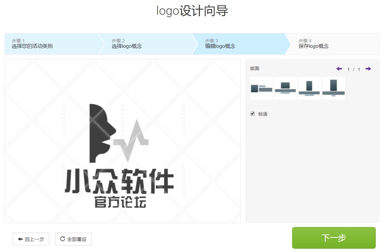 编辑完成,按”下一步”, 来瞧瞧logo概念在不同的背景下如何呈现。这只是草图,随时可修改。显示的背景仅供样品参考,logo将在无改变的状态下保存。