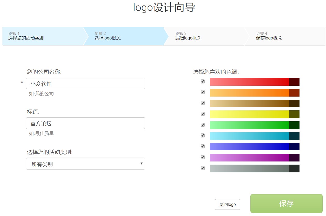 如下是”修改logo概念数据”,可修改名称、标语、业务及颜色。