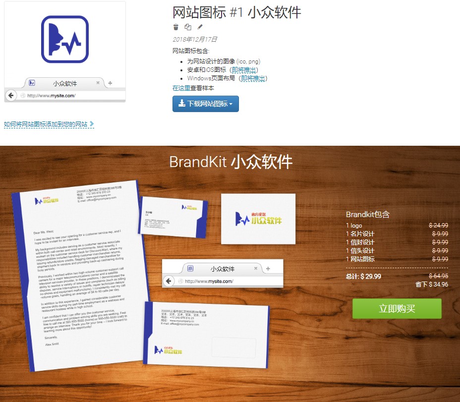 Brandkit以优惠的价格,能同时下载所创建的所有产品(logo、名片、信封、信头、网站图标)。您可以选择在支付前或后修改您的logo设计(颜色、字体等)