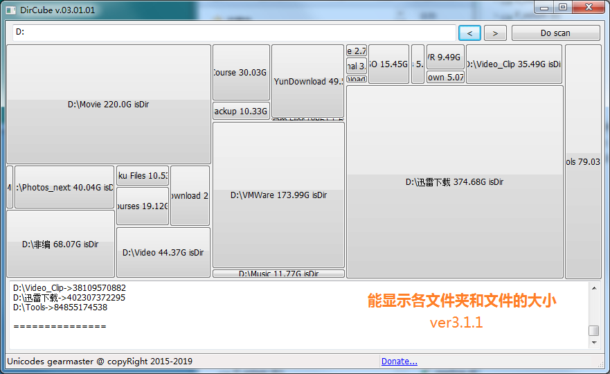 用大小不一的方块显示你的目录,功能上和SpaceSniffer类似,不过使用起来很简便,速度也还可以。
