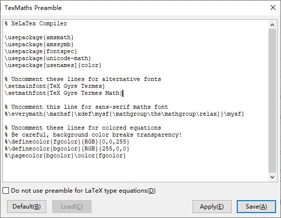 上面的公式是我用 TeX Gyre 字体打出来的。因为现在有人开发出来了专门的数学字体,知乎都有帖子做了介绍,所以我也倒腾了一个。但我是去 MDN 找了字体资源,然后下载安装。当我切换到 XeLaTeX 以后,插件里面点击 Preamble 就有专门的两条代码指定字体,我就在那改了字体,就像这样: