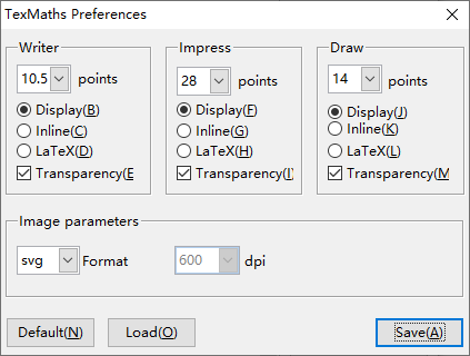 最上面四排按钮都是一些 TeX 代码的快捷键,用来输入各种版式,像什么括号啊,分数啊,角标啊,数学符号啊等等等等,点几个按钮都可以出来。点击 Preferences 可以设置字号、图片格式,如果你想做幻灯片(Impress)的话,建议勾上 Transparency。