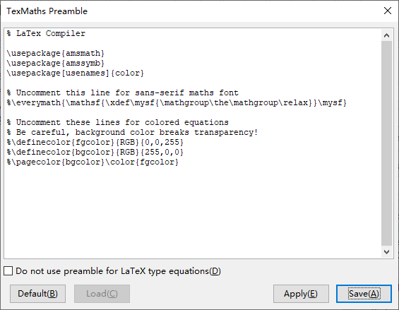 点击 Preamble 就会用 TeX 代码来做配置,包括使用的宏包、字体和颜色,凡是 % 开头的字都会被忽略掉。点击 Save 返回,输入代码,再点击 LaTeX 插件就开始运作。