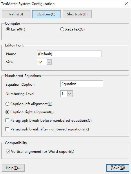 点击 Options 按钮以后,只见上面有两个选项,选择用 LaTeX 还是 XeLaTeX,此处按下不提。