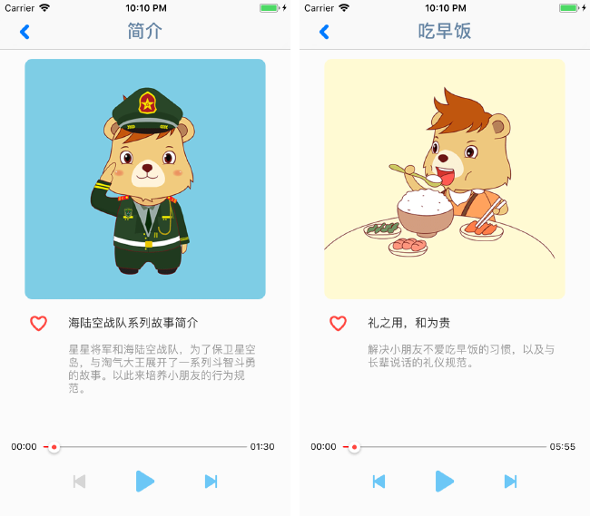 比如其中的海陆空系列,讲述了星星将军守卫星空岛故事。每一集故事中都会提出一个宝宝生活中的坏习惯,比如不爱吃、不睡觉、看电视,我们通过把宝宝带入到他喜欢的故事情节中,来引导他改正坏习惯,而不是单纯的说教方式教育。