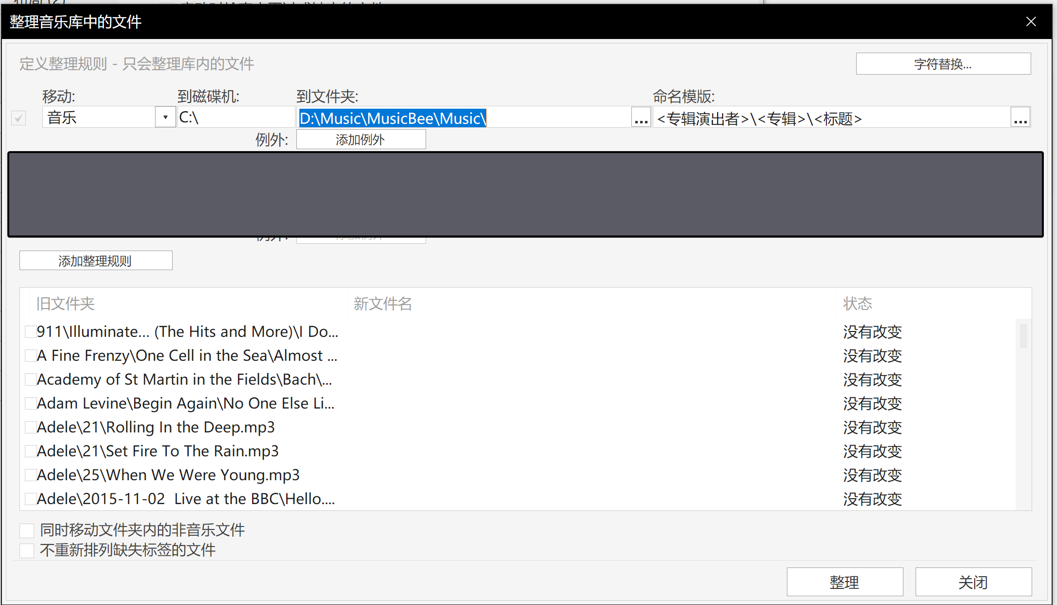 在这里的“到磁碟机”填C:\,这里应该是翻译有问题,说的是来源,你的音乐来源的根目录在c盘。在“到文件夹”那里填写第一步里你看到的库的地址,右上角命名模板可以自己尝试。我的截图里底下显示的状态是“没有改变”,因为已经整理过了,决定了以后可以点整理。