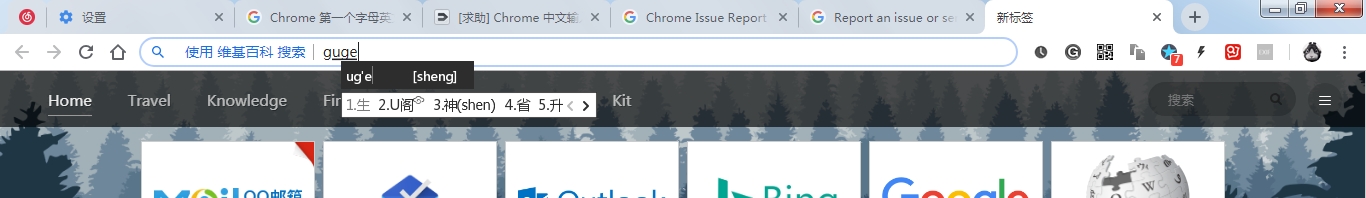 地址栏输入非默认的其他搜索引擎关键字然后按Tab或者空格,在键盘输入的第一个字符会直接上屏,中文输入法失效(如图),于是输入法接收的拼音字符串就全乱了