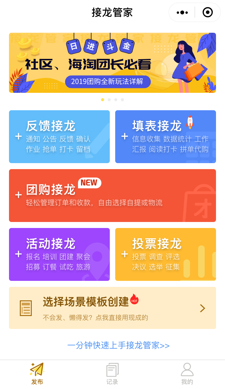 但如果在微信中使用“接龙管家”小程序,这些麻烦全都解决了。目前,接龙管家一共有五个功能,可以发布反馈接龙、活动接龙、填表接龙、投票接龙和团购接龙。