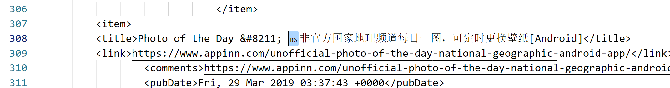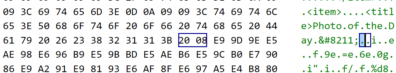 Unable to parse RSS feed: "XML syntax error on line 308: illegal character code U+0008"